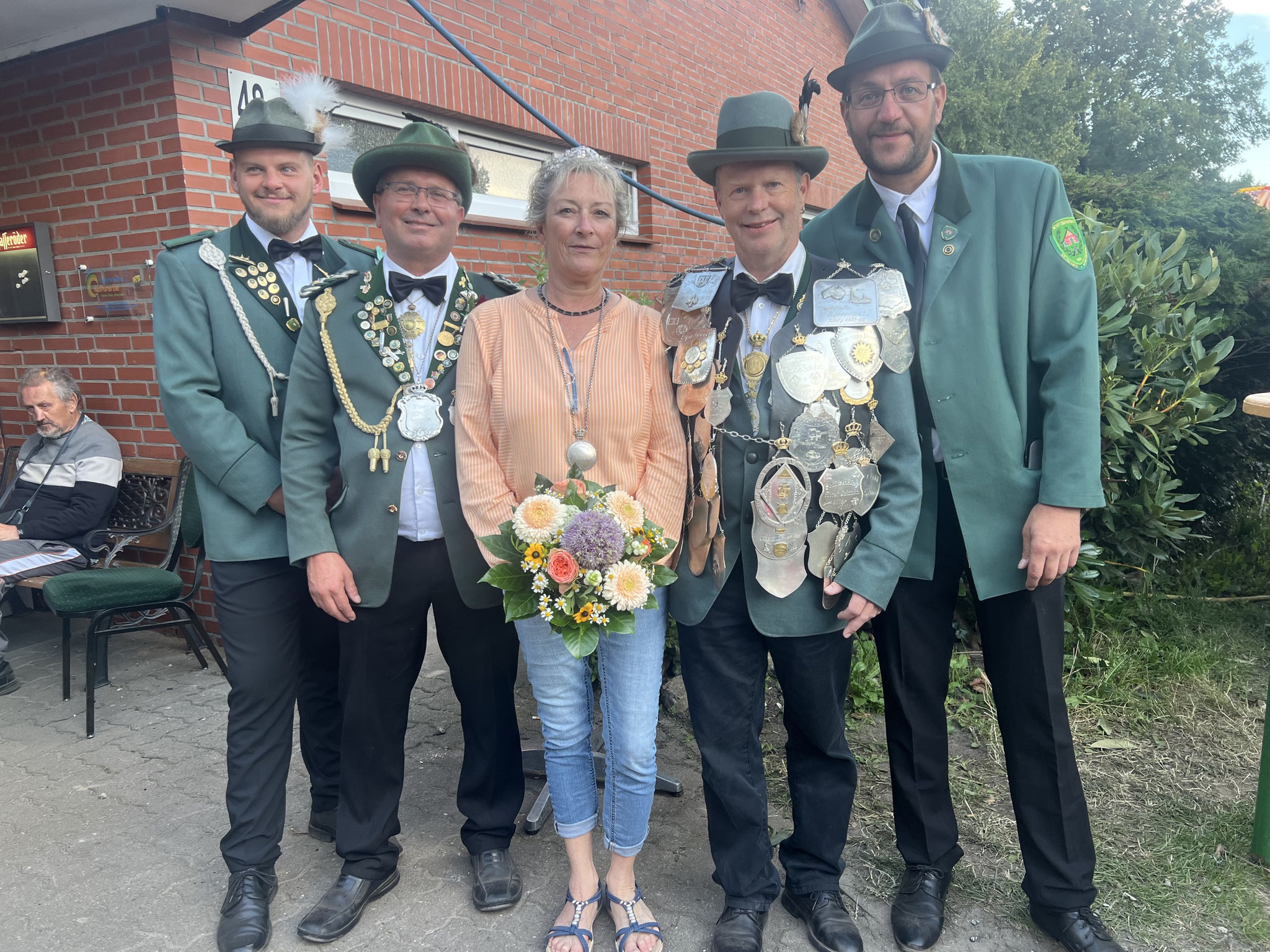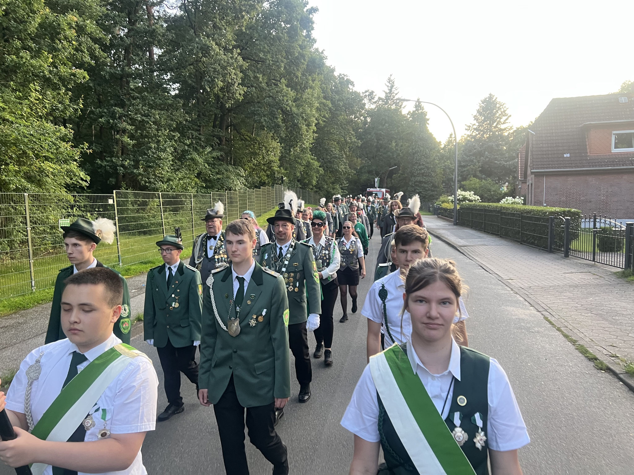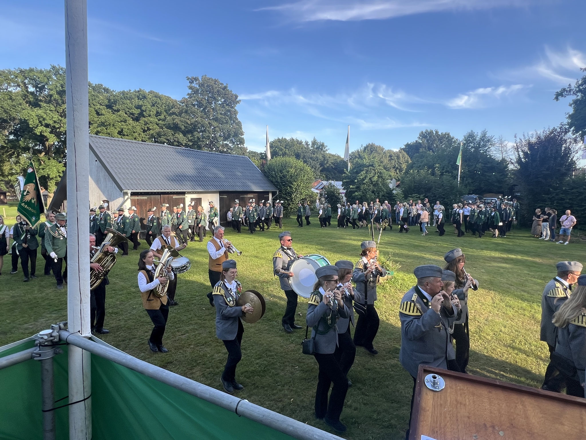 Am frühen Abend folgte der große Festmarsch mit rund 120 Schützinnen und Schützen, begleitet vom Spielmannszug Neu Wulmstorf und den Holsteiner Hornbläsern. Station wurde an der Königsburg im Scheideholzweg gemacht, wo Pastorin Wolf feierlich die Vereinsfahne segnete, ein emotionaler Moment für viele, darunter viele Ehrenmitglieder und Ehrenvorsitzender Manfred. In der anschließenden Rast servierte das Königspaar Gerald und Maike gekühlte Getränke in allen Variationen, bevor der Reigen weiter zur Festwiese zog. Mit einem Zapfenstreich und anschließenden Kommers wurde der Tag würdevoll beendet.