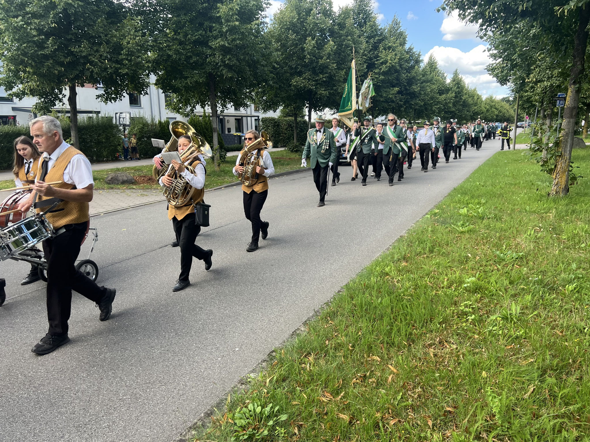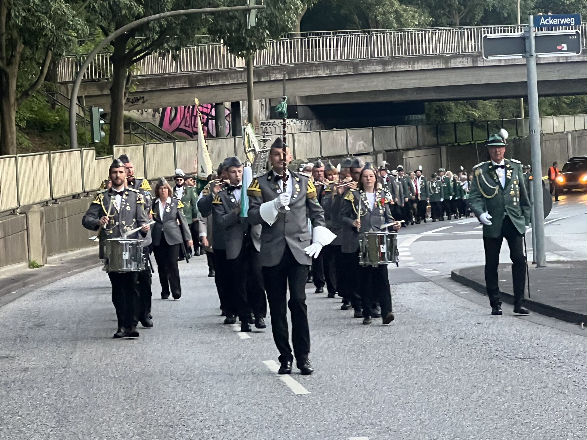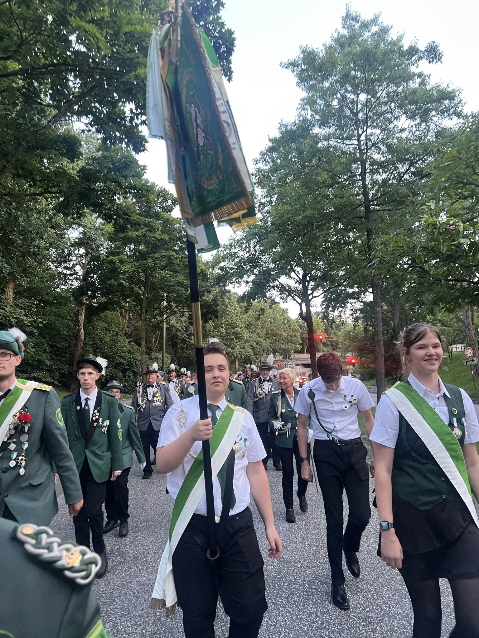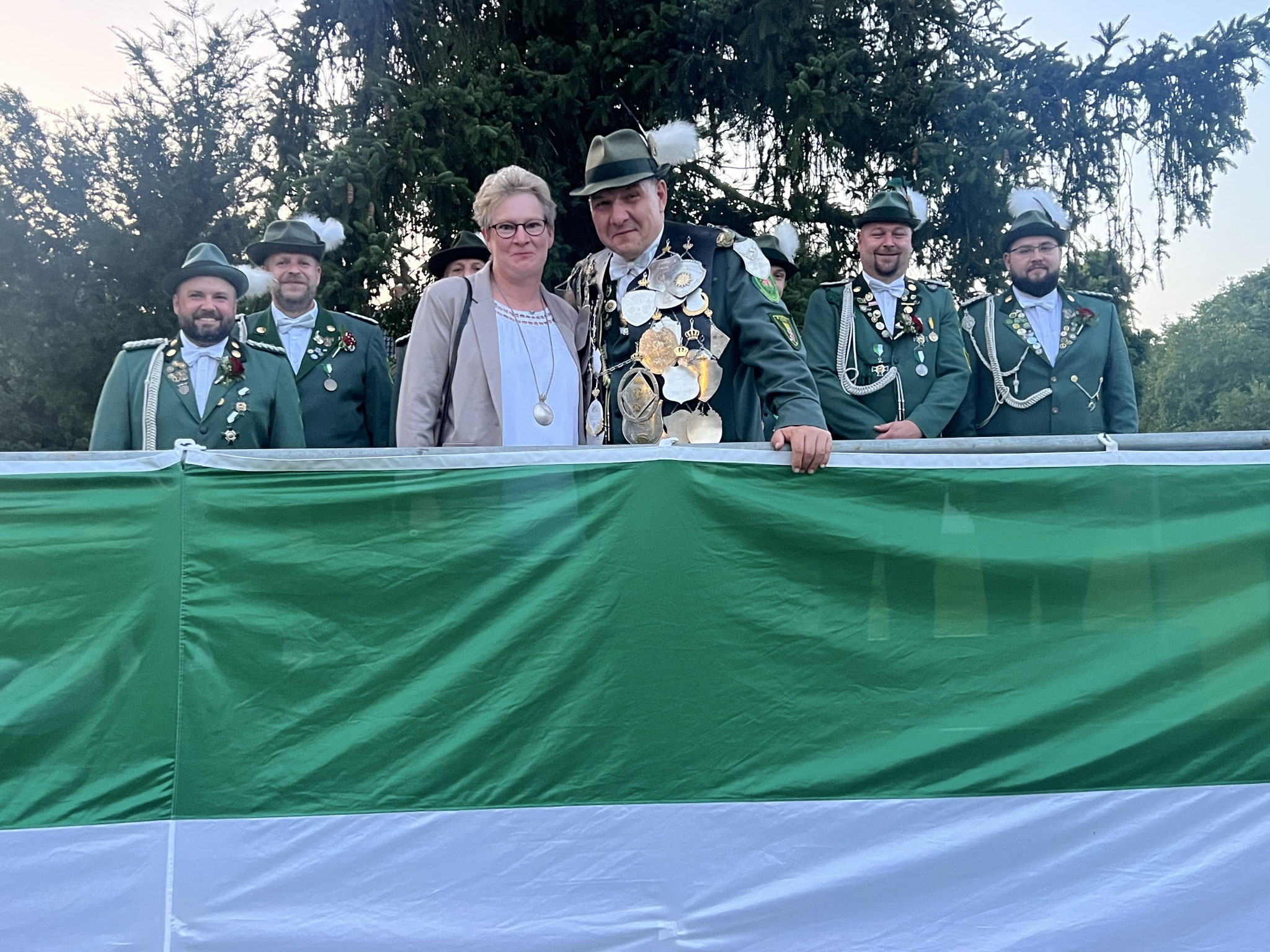 Am frühen Abend folgte der große Festmarsch mit rund 120 Schützinnen und Schützen, begleitet vom Spielmannszug Neu Wulmstorf und den Holsteiner Hornbläsern. Station wurde an der Königsburg im Scheideholzweg gemacht, wo Pastorin Wolf feierlich die Vereinsfahne segnete, ein emotionaler Moment für viele, darunter viele Ehrenmitglieder und Ehrenvorsitzender Manfred. In der anschließenden Rast servierte das Königspaar Gerald und Maike gekühlte Getränke in allen Variationen, bevor der Reigen weiter zur Festwiese zog. Mit einem Zapfenstreich und anschließenden Kommers wurde der Tag würdevoll beendet.