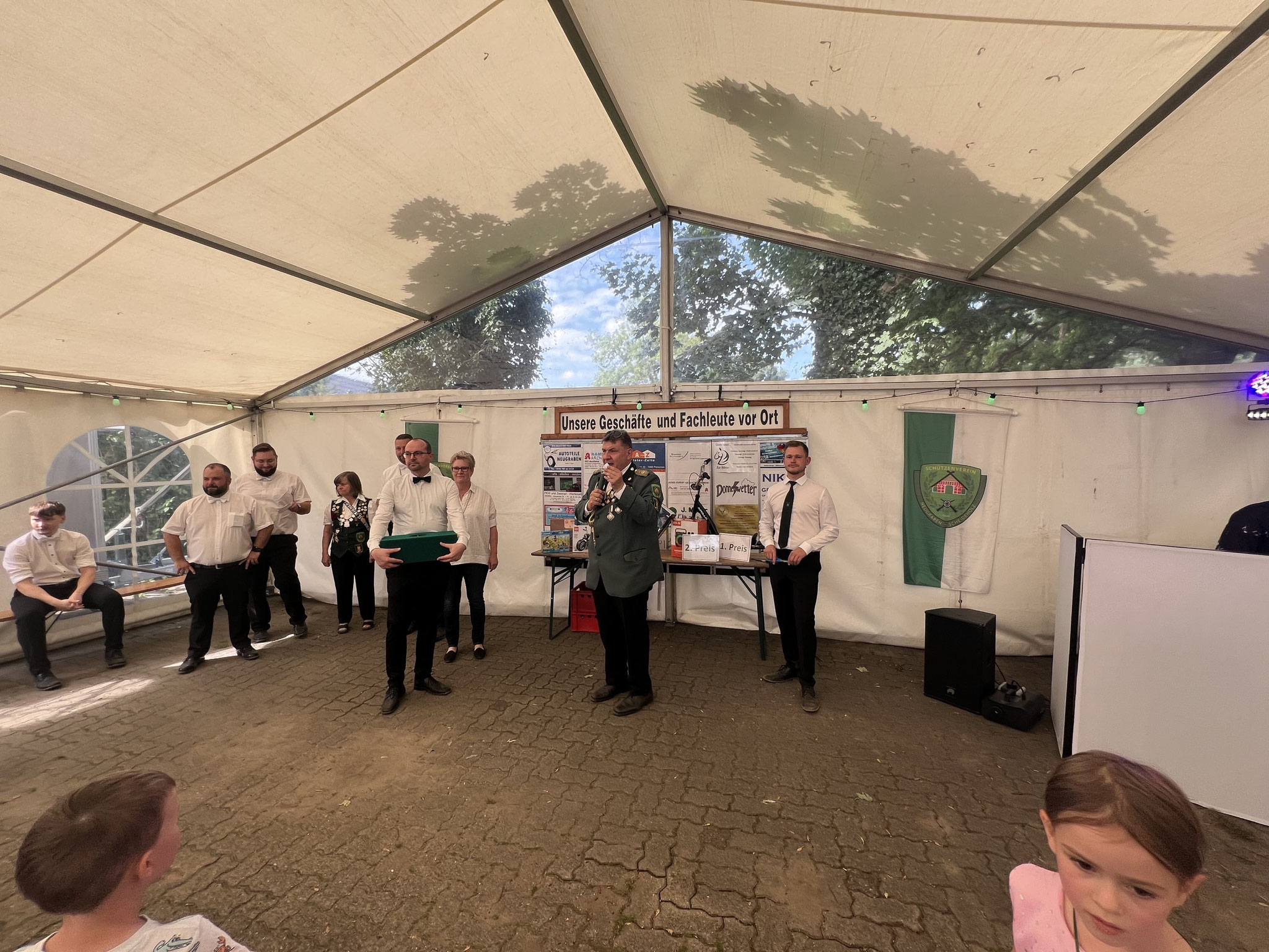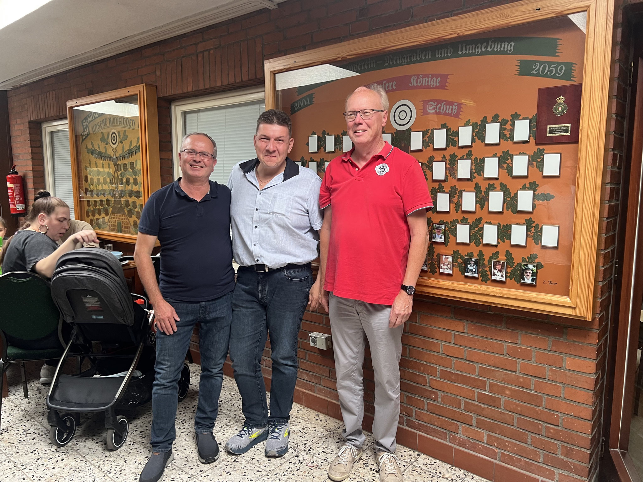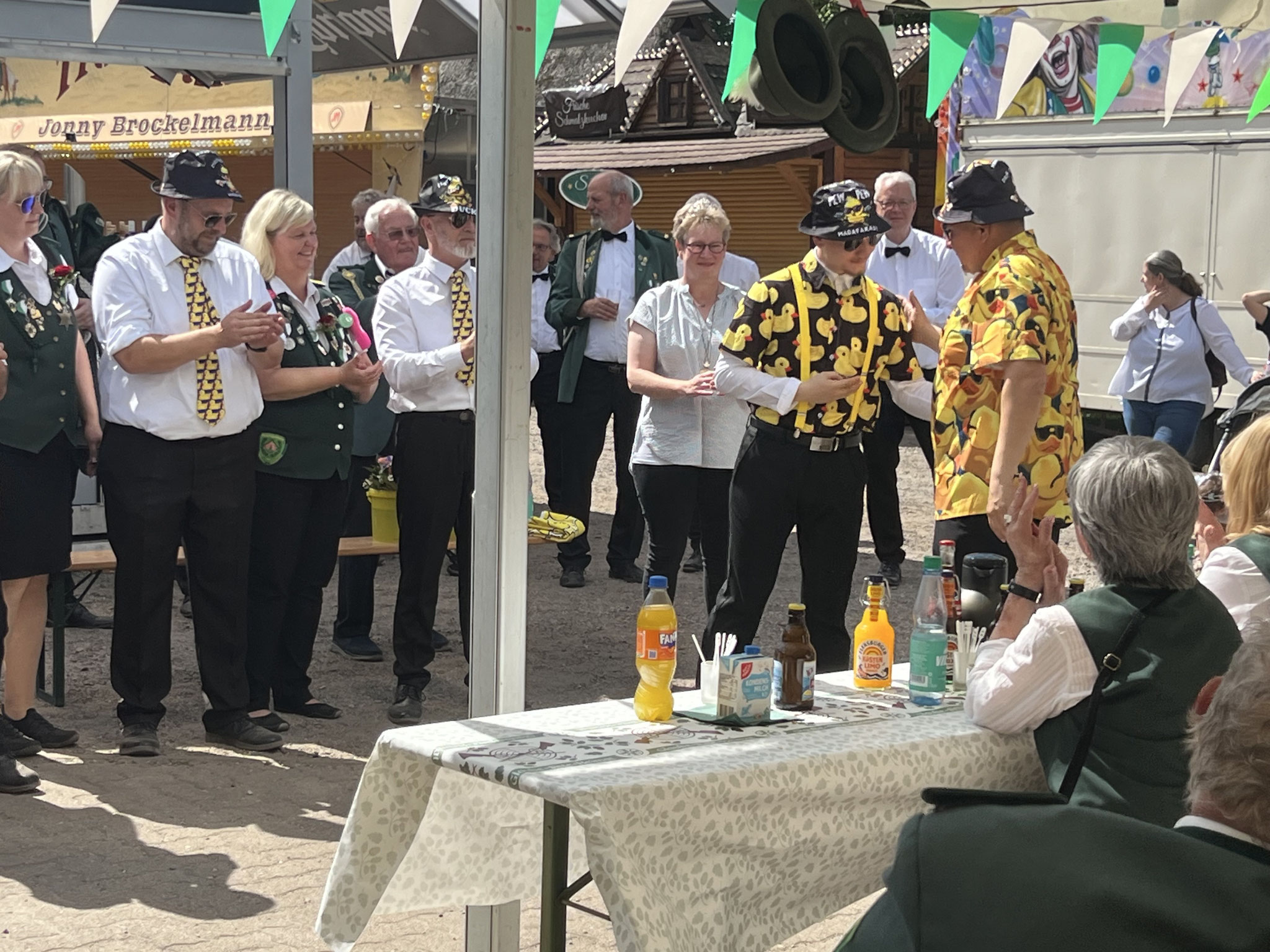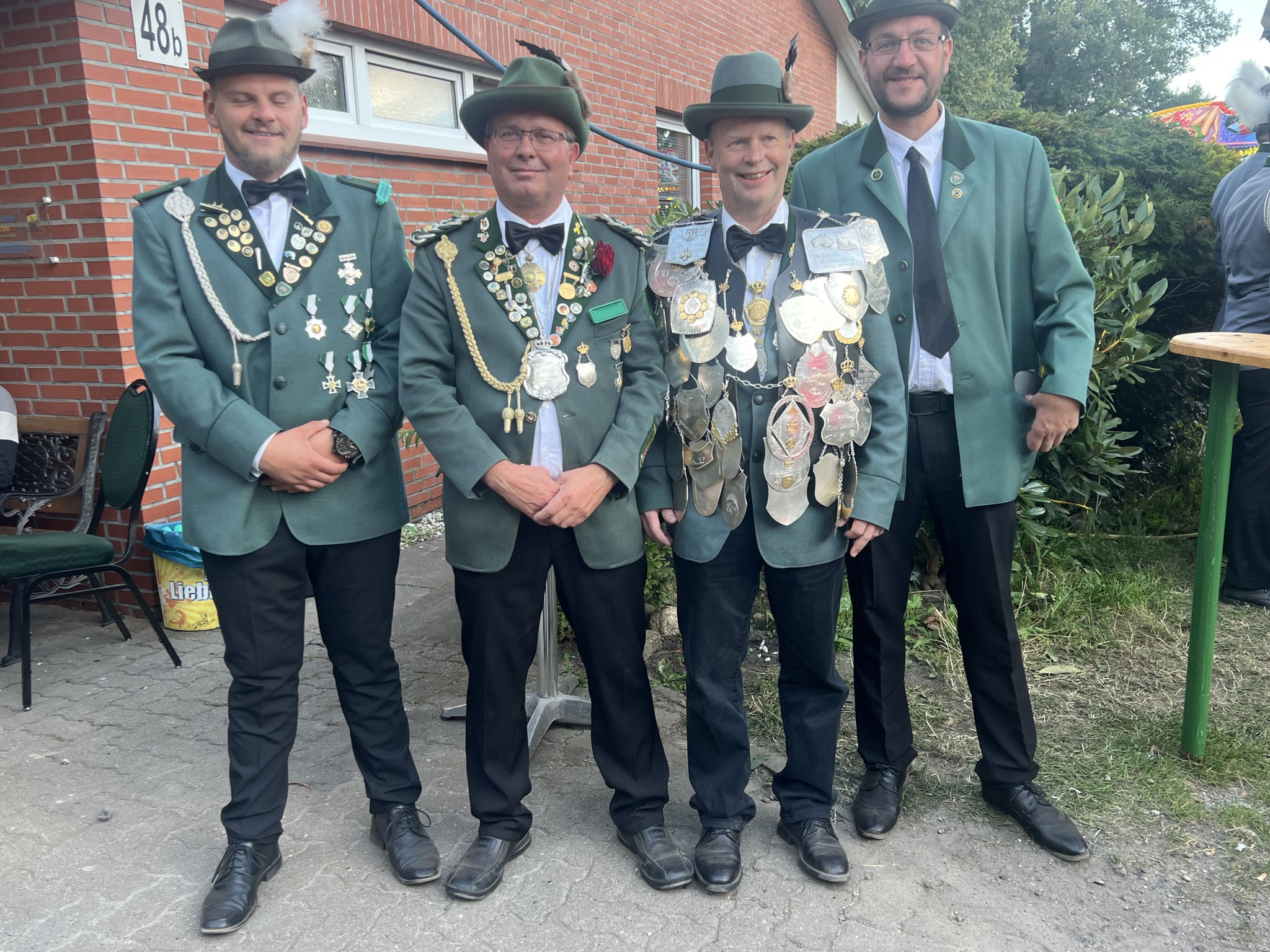 Am Nachmittag kam es schließlich zum spannendsten Moment: Beim Vogelschießen um die Königswürde lieferten sich Maurice, Andreas, Torsten und Rainer ein packendes Duell. Um 16:33 Uhr fiel der Rumpf des von Norbert gebauten Königsvogels nach 340 Schüssen. Der neue Schützenkönig Rainer, seit 23 Jahren Vereinsmitglied und im Ort als „Landesrainer“ bekannt, ernannte André, Maurice und Mario zu seinen Adjutanten.
