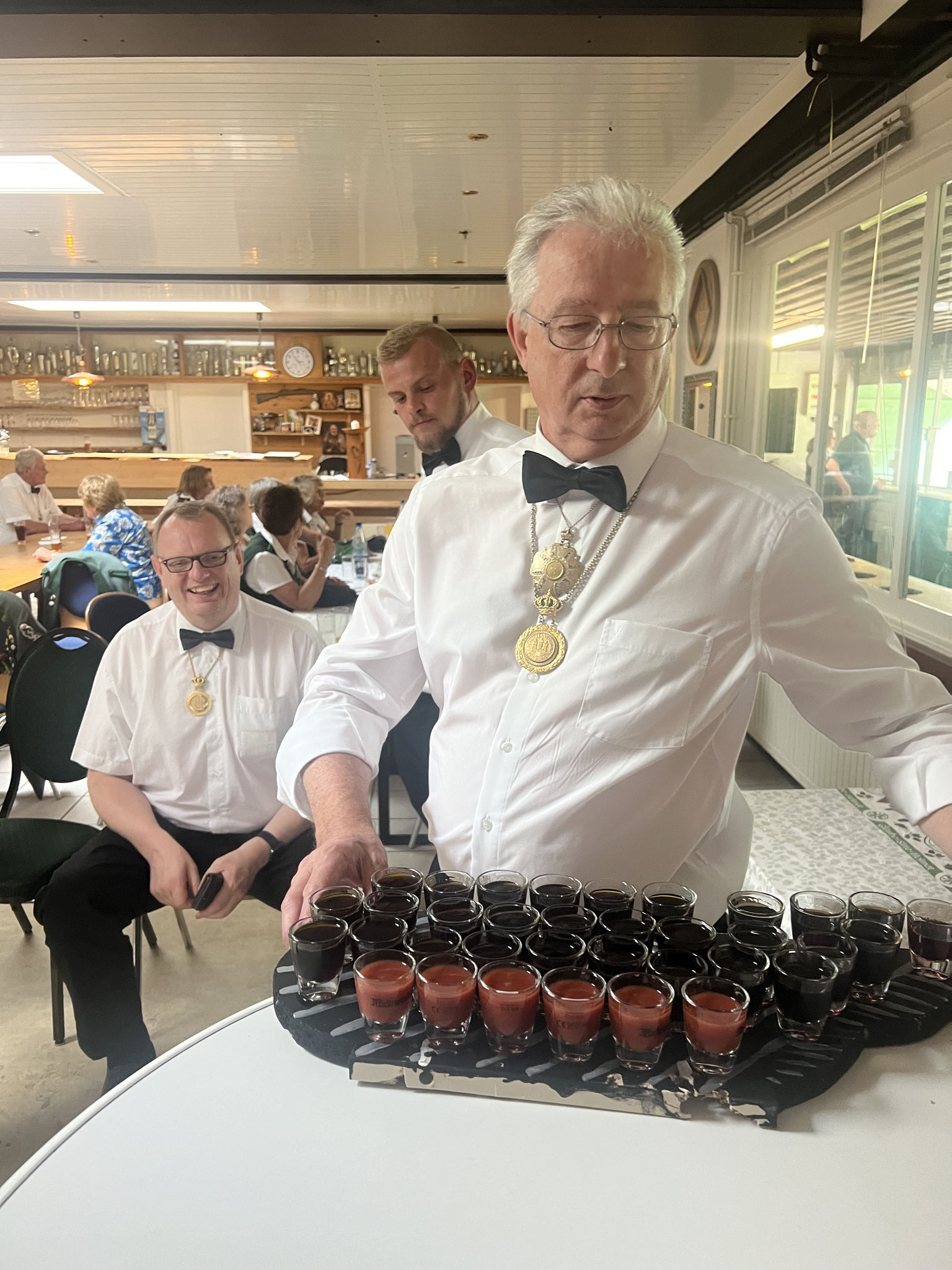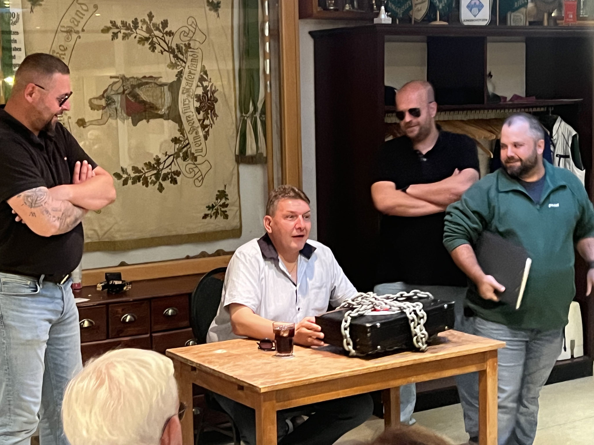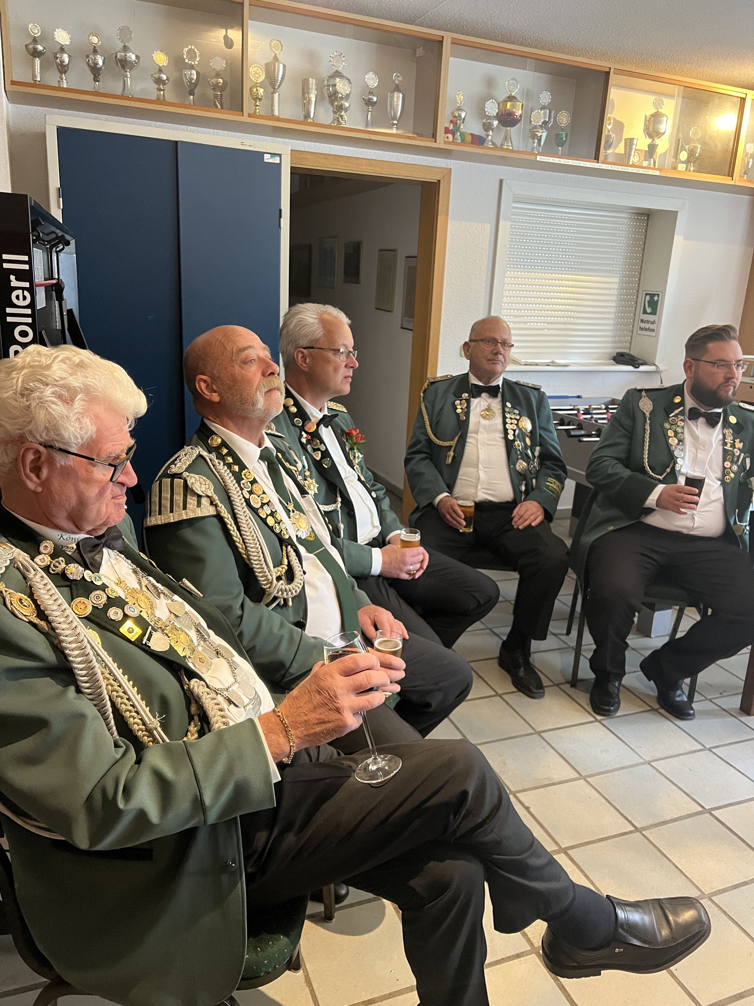 Damit ist Tobi der neue Bierkönig 2025/26 – gekrönt im Glanz des Gerstensafts und mit Applaus aller Anwesenden. Als Adjutanten wählte er Jan-Peter und Matze, die sich nahtlos in ihre neue Aufgabe einlebten und fortan für die Bewirtung sorgten. Mit einem dreifachen, lautstarken „Gut Schuss!“ wurde das neue Königsteam gefeiert und die Familie Hadler für ihre Gastfreundschaft hochleben gelassen.