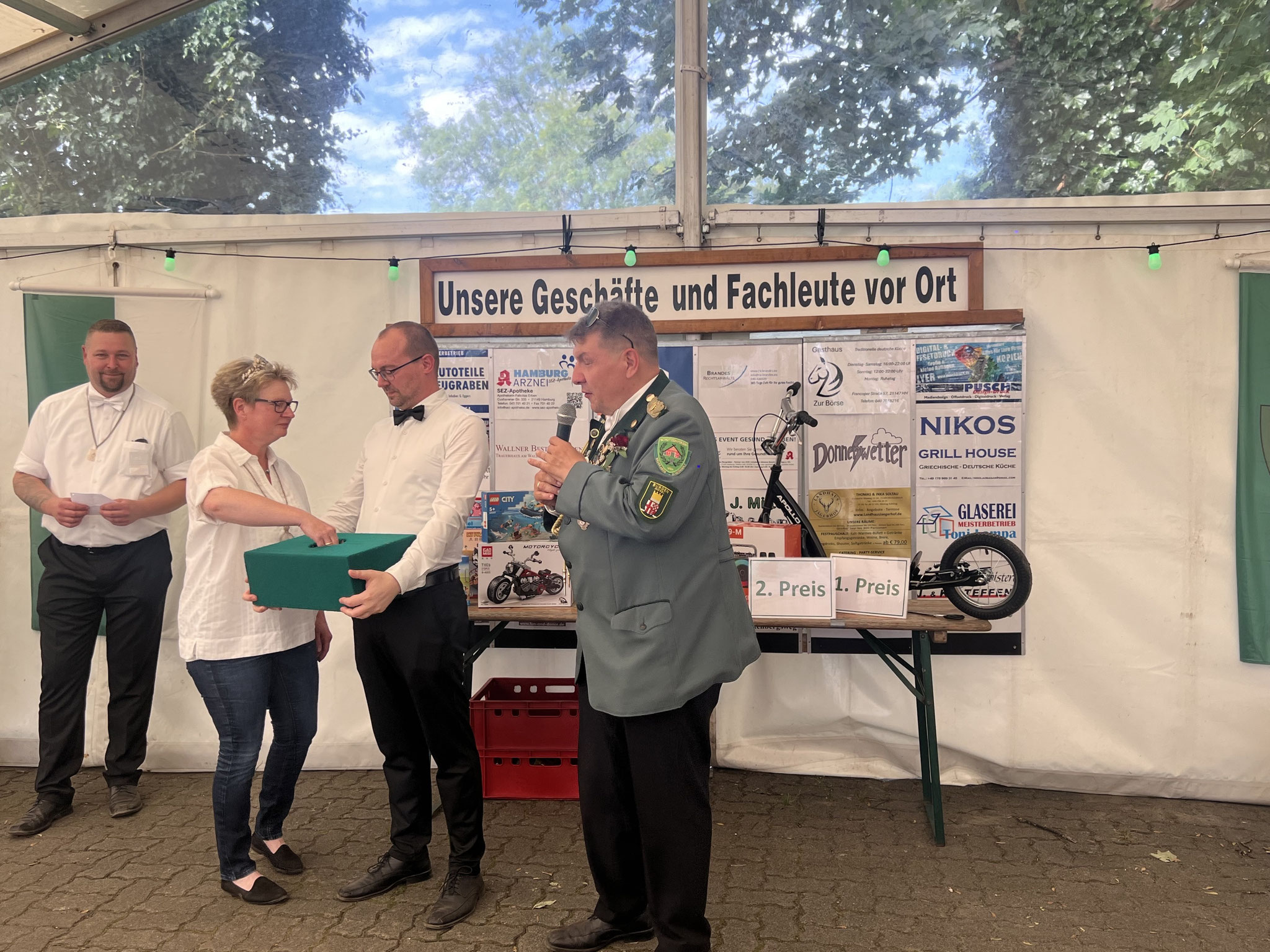 Der Samstag stand ganz im Zeichen des ersten Schusses auf den Holzvogel, der Kinderdisco mit der Verlosung der Hauptpreise und des Festessens, zu dem neben den Vereinsmitgliedern auch die Schützenvereine aus Burgen (Mosel), Hausbruch, Fischbek, zu Moorburg, Altstadt Harburg, Heimfeld, Eißendorf und der Sportgemeinschaft Zoll eingeladen waren. Bei der Ansprache ehrte der 1. Vorsitzende Frank gemeinsam mit der Präsidentin des Kreisverbandes Harburg Stadt, Martina Wiechers, verdiente Vereinsmitglieder wie Florian, Nicole, Daniel, Jürgen und Helmut sowie langjährige Mitglieder wie Petra, Maike, Holger, Hans Ludwig und Johann.