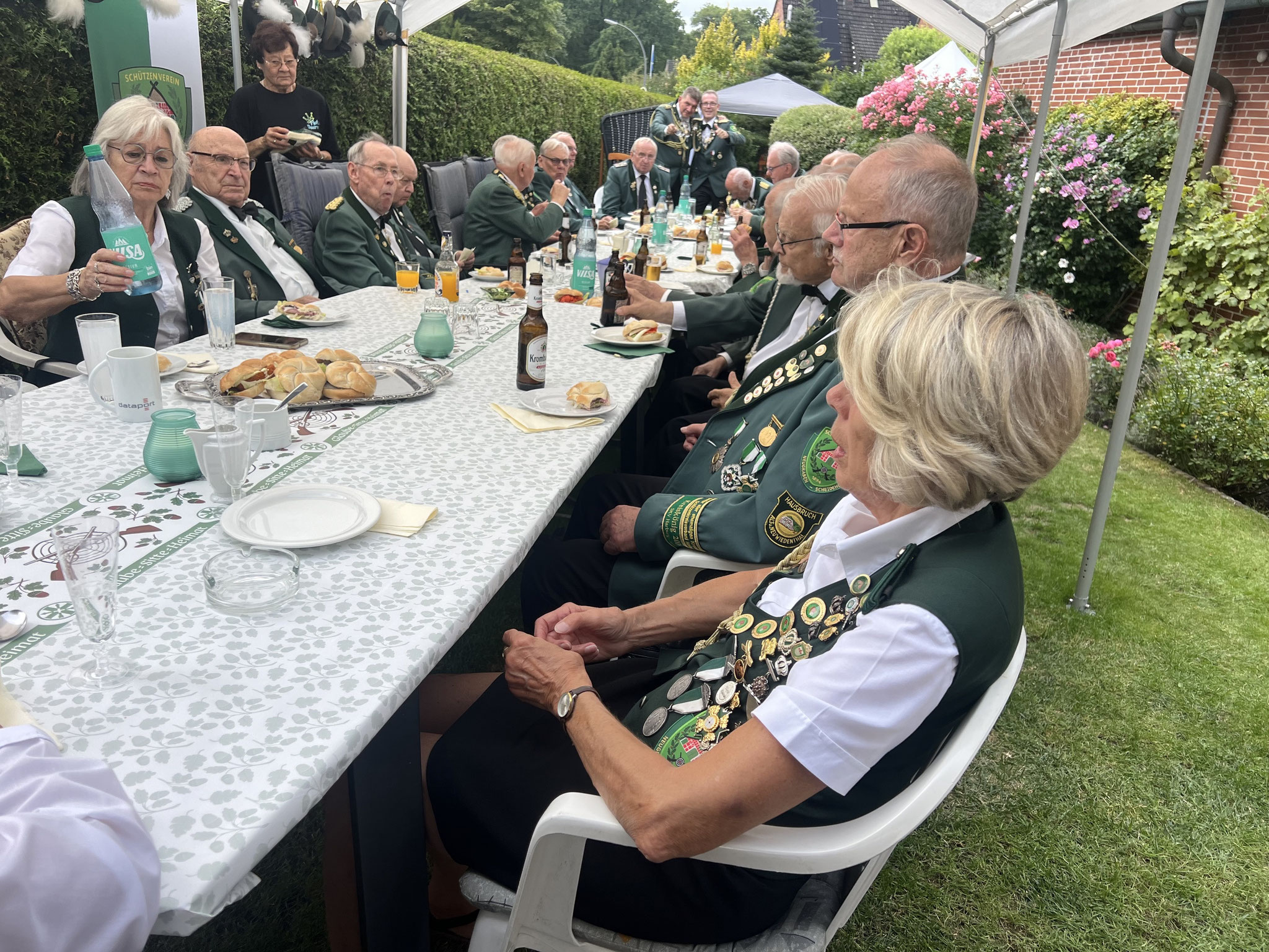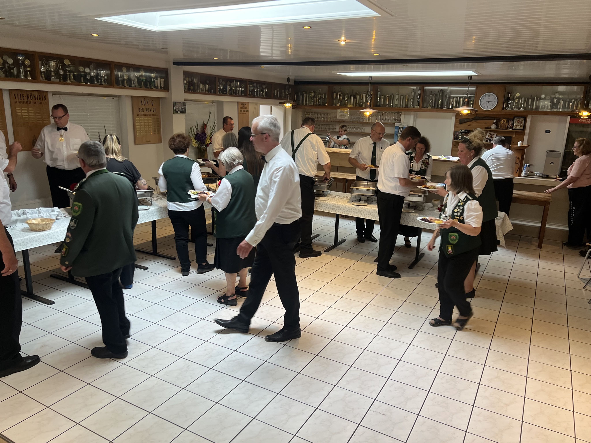 Und am Sonntag? Ausschlafen? Fehlanzeige! Um 8:20 Uhr holten Frank, Gerd und Nicole unseren König und sein Gefolge pünktlich ab. Dann hieß es: Ab zur Schützenhalle Fischbek! Marschieren, Stärkung beim Kinder- und Jungschützenkönig (vielen Dank euch!), Königspaar Michael & Anja abholen und gemeinsam in die Königsburg einziehen. Drinnen wartete ein tolles Schützenfrühstück mit allem Drum und Dran: Aufschnitt, Ei, Rollmops, Gurken, Fleischsalat, liebevoll von über 30 fleißigen Helferinnen serviert. Reden, Auszeichnungen, Bläsermusik, ein kurzweiliger und schöner Abschluss.