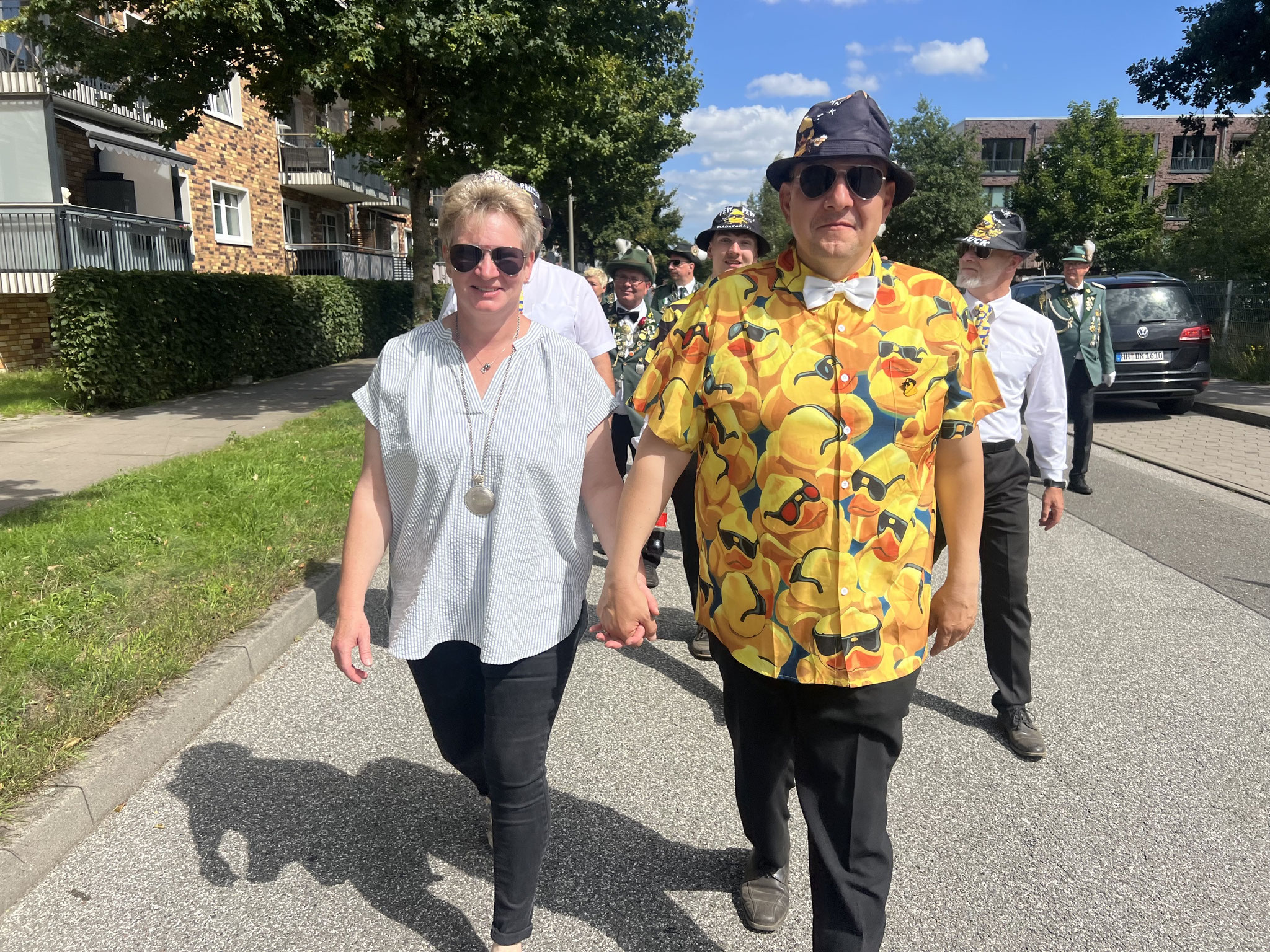 Am dritten Schützenfesttag traf sich die Neugraben-Scheideholzer Schützenfamilie mit den Holsteiner Hornbläsern und Gästen aus nah und fern an der Gaststätte „Zur Börse“ zum Ummarsch. Zuerst wurde der Jungschützenkönig Lasse bei Hadlers Scheune abgeholt. Nach einer kleinen Pause erschienen die Damen in Krankenschwesterkleidung, während Walter und Heiner vom Musikzug als „Mode-Designer“ Rudolph Mooshammer und Harald Glööckler sowie Petra als Modepuppe Susi mitmarschierten. Ein Bild, das im Laufe des Tages noch für viele Lacher sorgte. Vom Jungschützenkönig ging es zur Königsburg, wo das Frühstück ein geselliger Höhepunkt war. Die fleißigen Helferinnen servierten frische Brötchen, heißen Kaffee und herzhafte Spezialitäten.